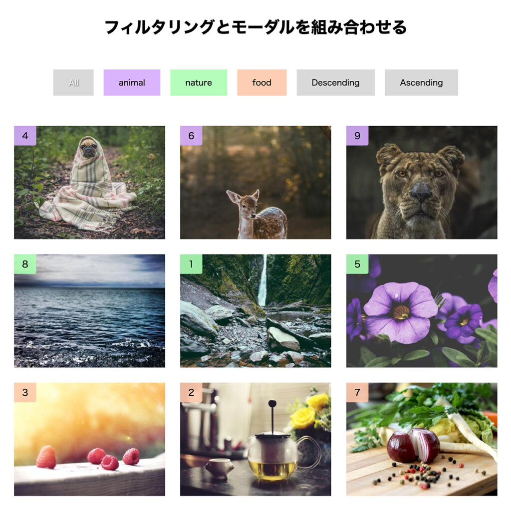 画像のフィルタリング、モーダルを使用したページを作成した。